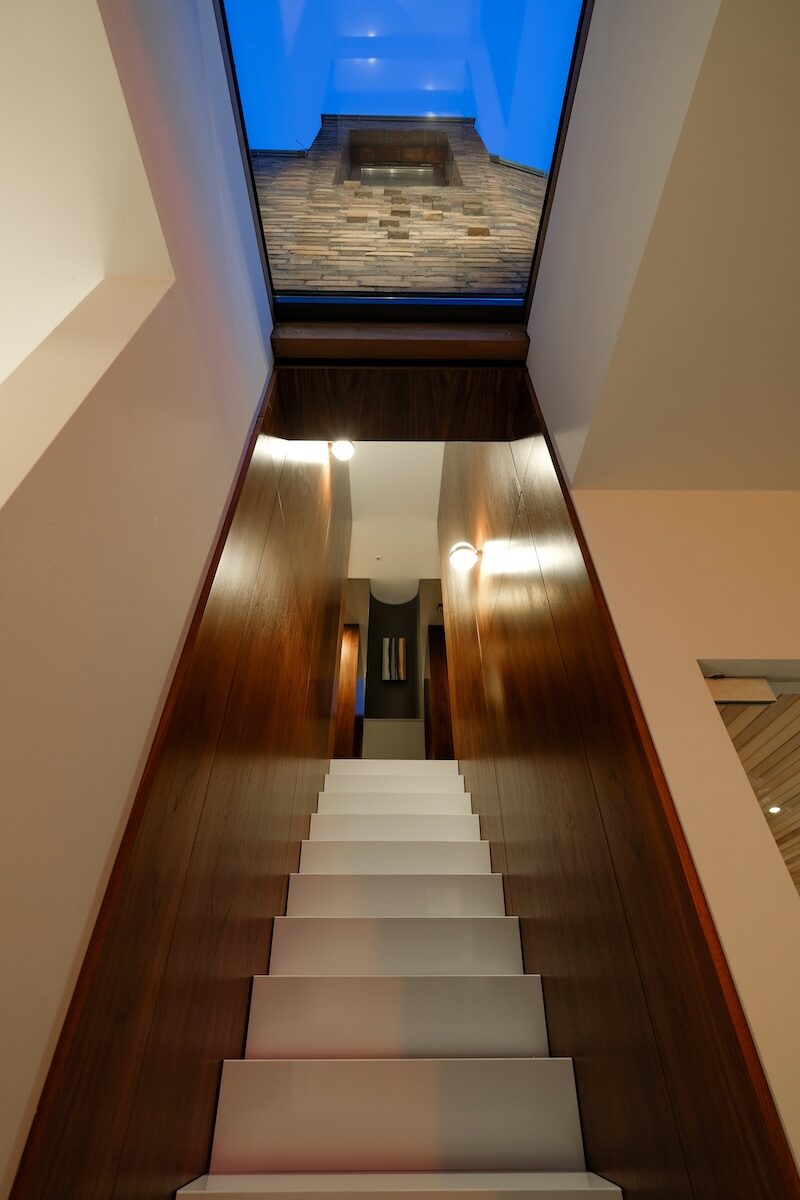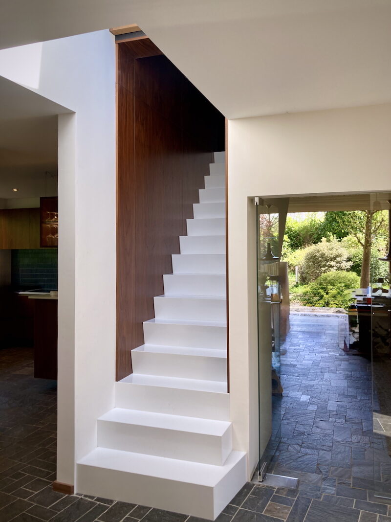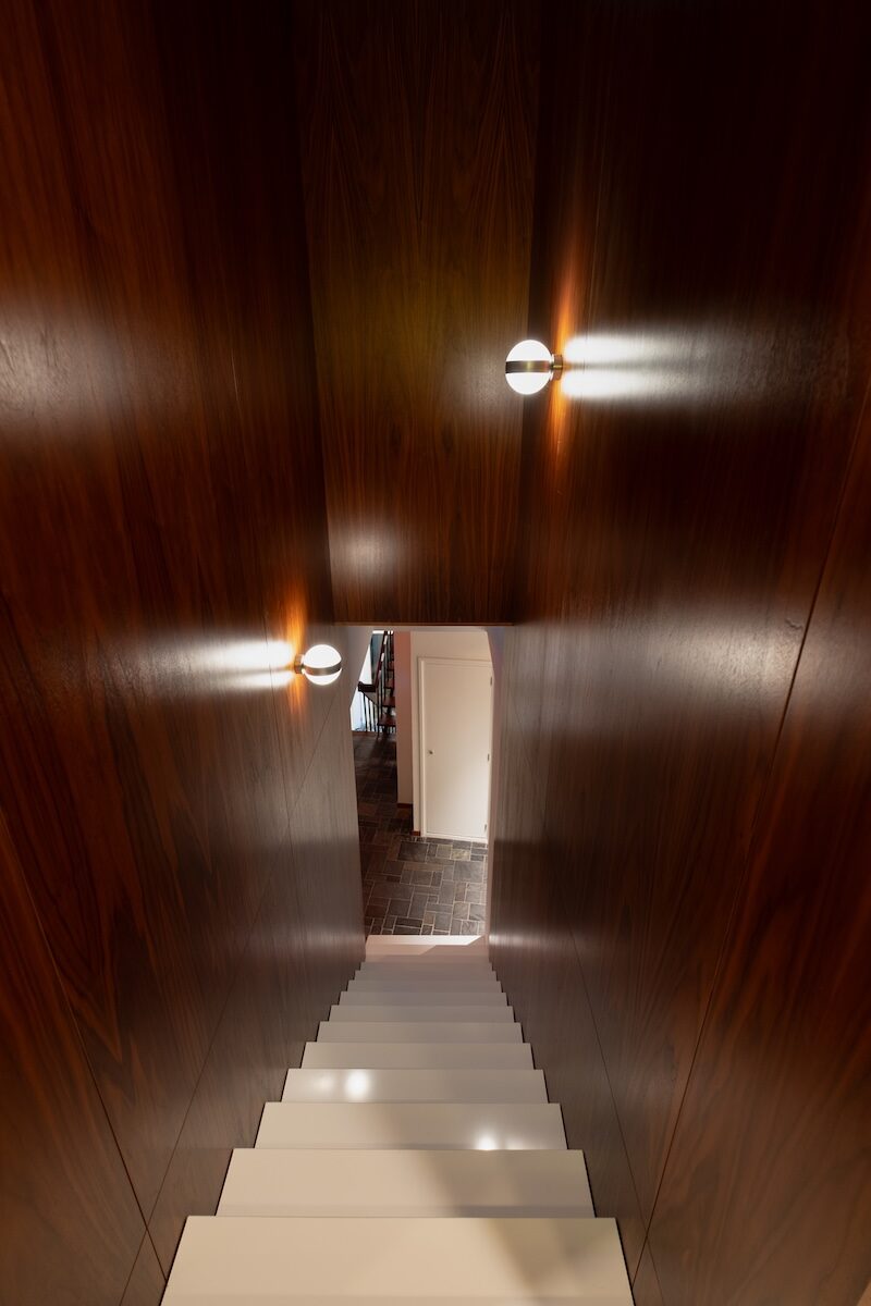 Waar de nieuwe opbouw de bestaande woning raakt, is de kans gegrepen om meer licht en verbinding met de tuin te creëren. Een nieuwe houten pui verbindt de woonkamer met buiten, en de trap naar de opbouw laat daglicht diep in het hart van de villa binnenstromen.