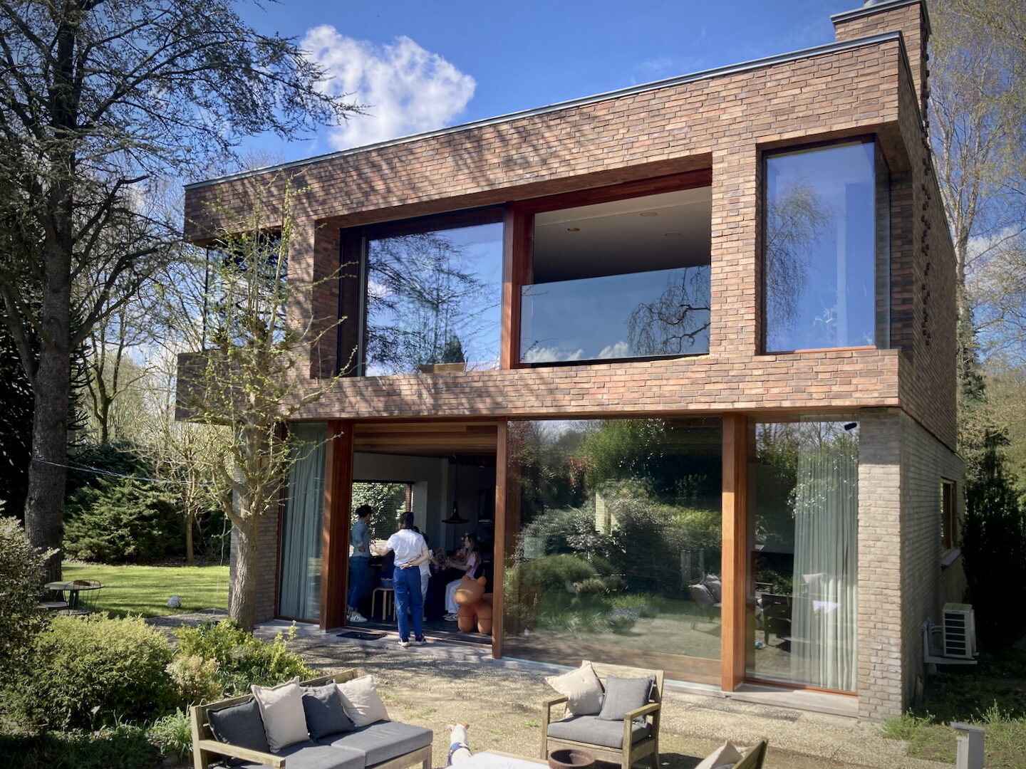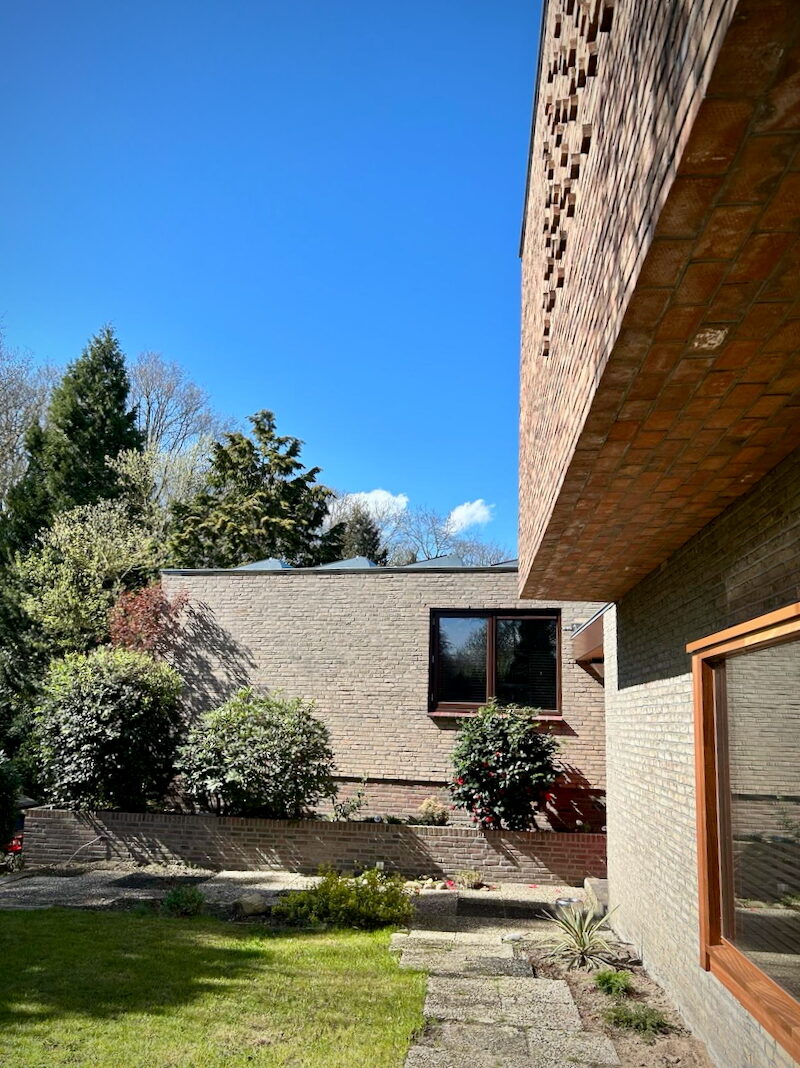 De gevel van opbouw is bekleed met Petersen metselstenen, net als de bestaande villa gemetseld in wildverband. Op een aantal plekken hebben wij verbijzonderingen in het metselwerk aangebracht door de kopse stenen te laten uitsteken. De puien zijn uitgevoerd in Iroko hout. En net als in vele van onze projecten is de isolatie van houtvezel. Dit levert niet enkel een goede isolatiewaarde, maar levert ook een prettig binnenklimaat op.